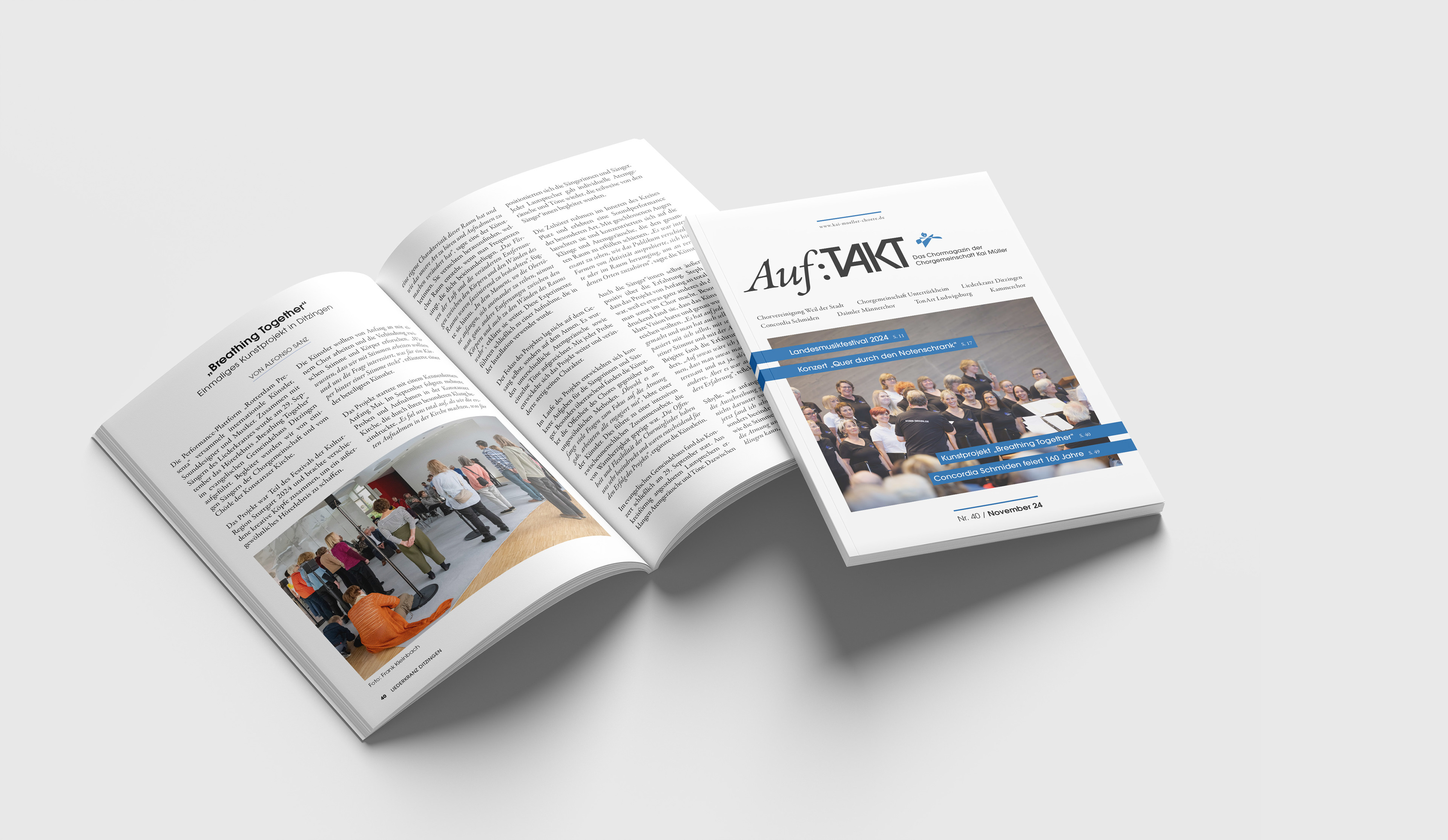 Seit Anfang 2024 darf ich im Auftrag der Chorgemeinschaft Kai Müller die Gestaltung des Chormagazins Magazins "Auf:Takt" übernehmen. In diesem Zusammenhang erfolgte Anfang 2024 zuallererst ein Re-Design des Magazins unter Berücksichtigung des existierenden Styleguides der Chorgemeinschaft. Dabei erhielt das Magazin seine neue Wortmarke, sowie sein neues Layout. Inzwischen findet meine Arbeit für die Chorgemeinschaft hauptsächlich zwischen der Kommunikation mit den Redaktionen und dem Erhalt ihrer Inhalte bis hin zur Erstellung der finalen Druckdaten statt.
